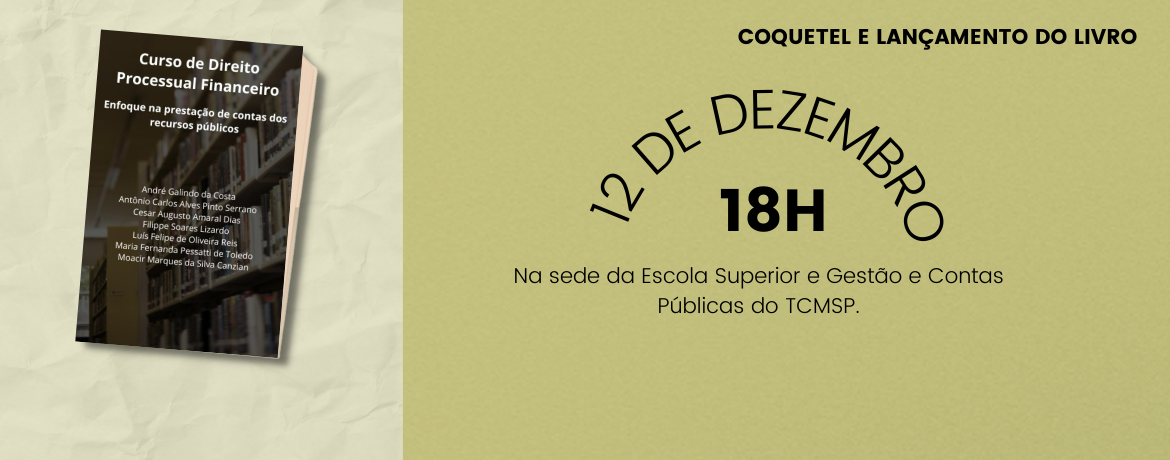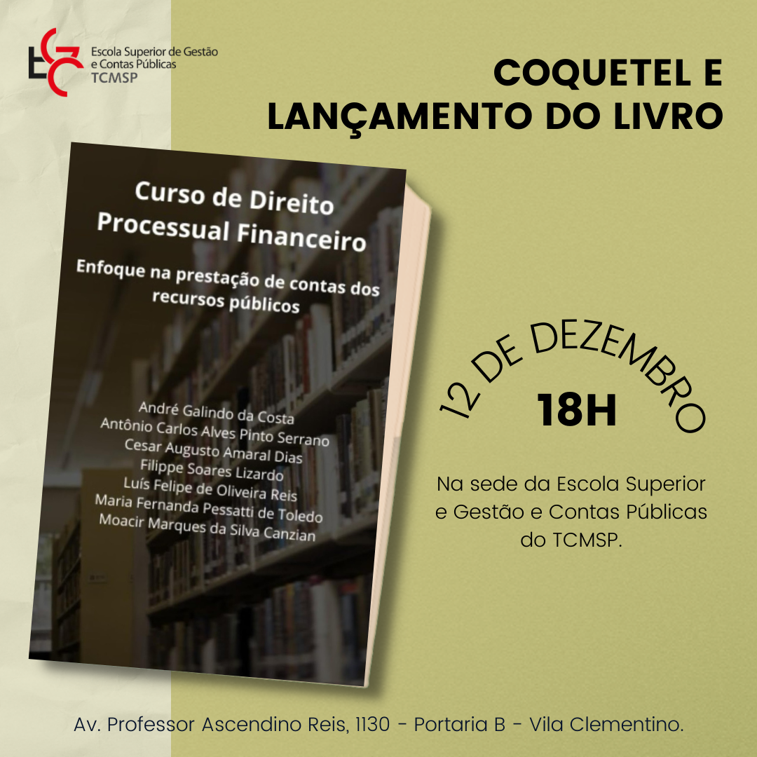 Será lançado, em 12 de dezembro, a partir das 18 horas, no auditório da Escola Superior de Gestão e Contas Públicas (EGC) do Tribunal de Contas do Município de São Paulo (TCMSP), o livro “Curso de Direito Processual Financeiro – Enfoque na prestação de contas dos recursos públicos”. A obra, escrita por professores com atuação nas Cortes de Contas, particularmente no TCMSP, traz um conjunto de assuntos sobre o comportamento das contas públicas e a prestação de contas de recursos públicos, com enfoque no processo de fiscalização adotado pelos Tribunais de Contas.