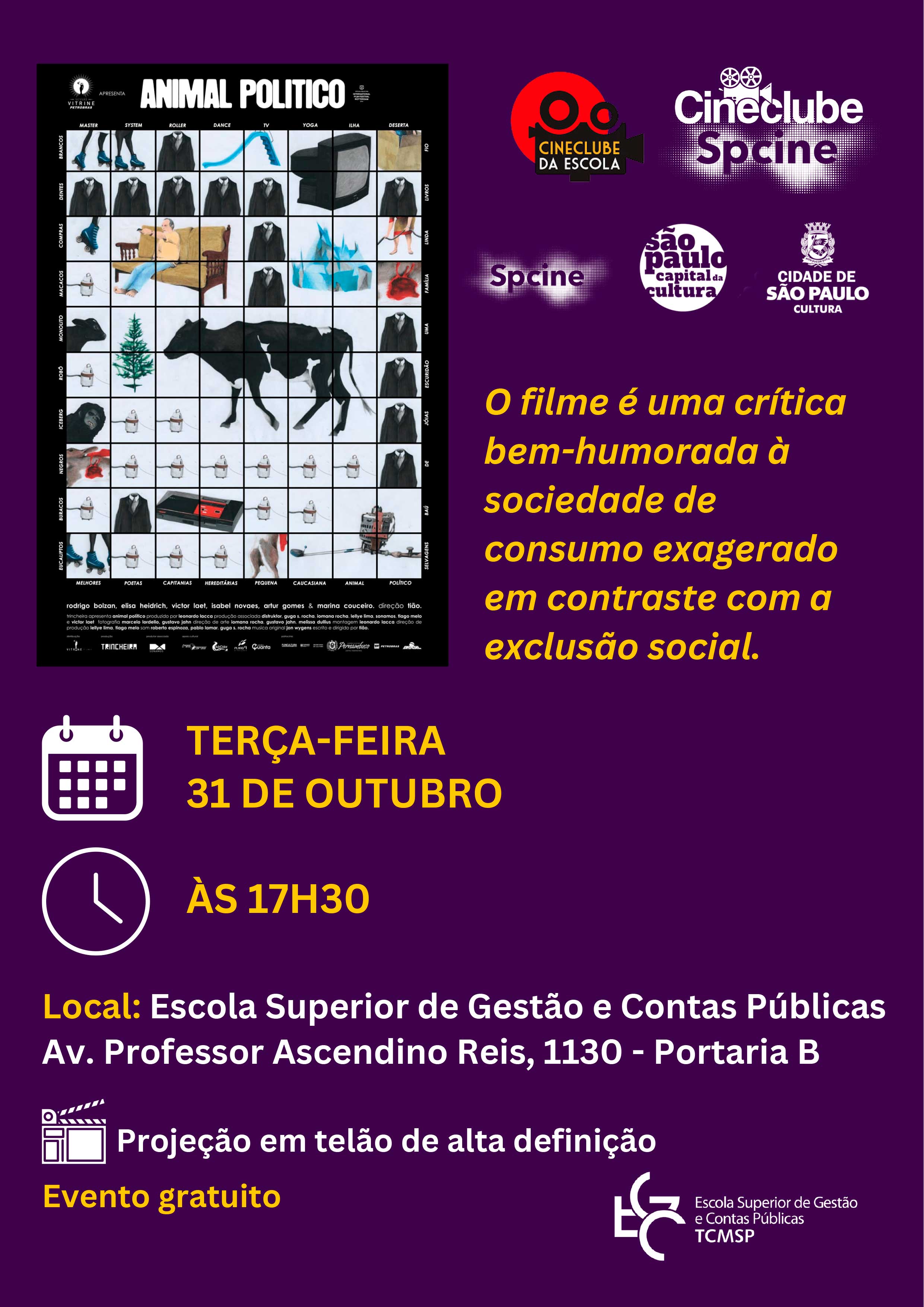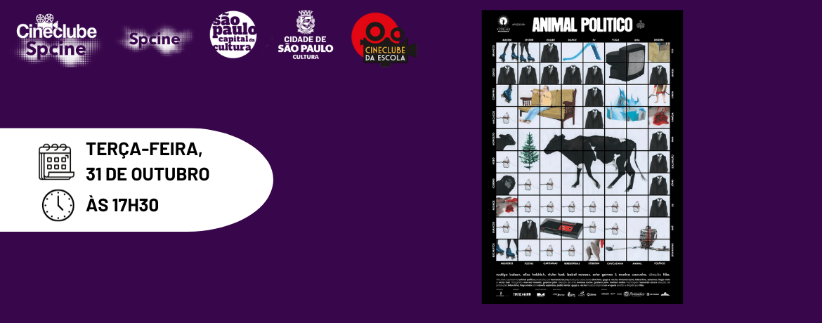 O polêmico filme “Animal Político” será apresentado gratuitamente no próximo dia 31/10 (terça-feira), às 17h30, no Cineclube da Escola Superior de Gestão e Contas Públicas (EGC), do Tribunal de Contas do Município de São Paulo (TCMSP). A exibição no auditório da EGC integra o projeto Cineclube Spcine, da Empresa de Cinema e Audiovisual de São Paulo, ligada à Secretaria Municipal de Cultura.