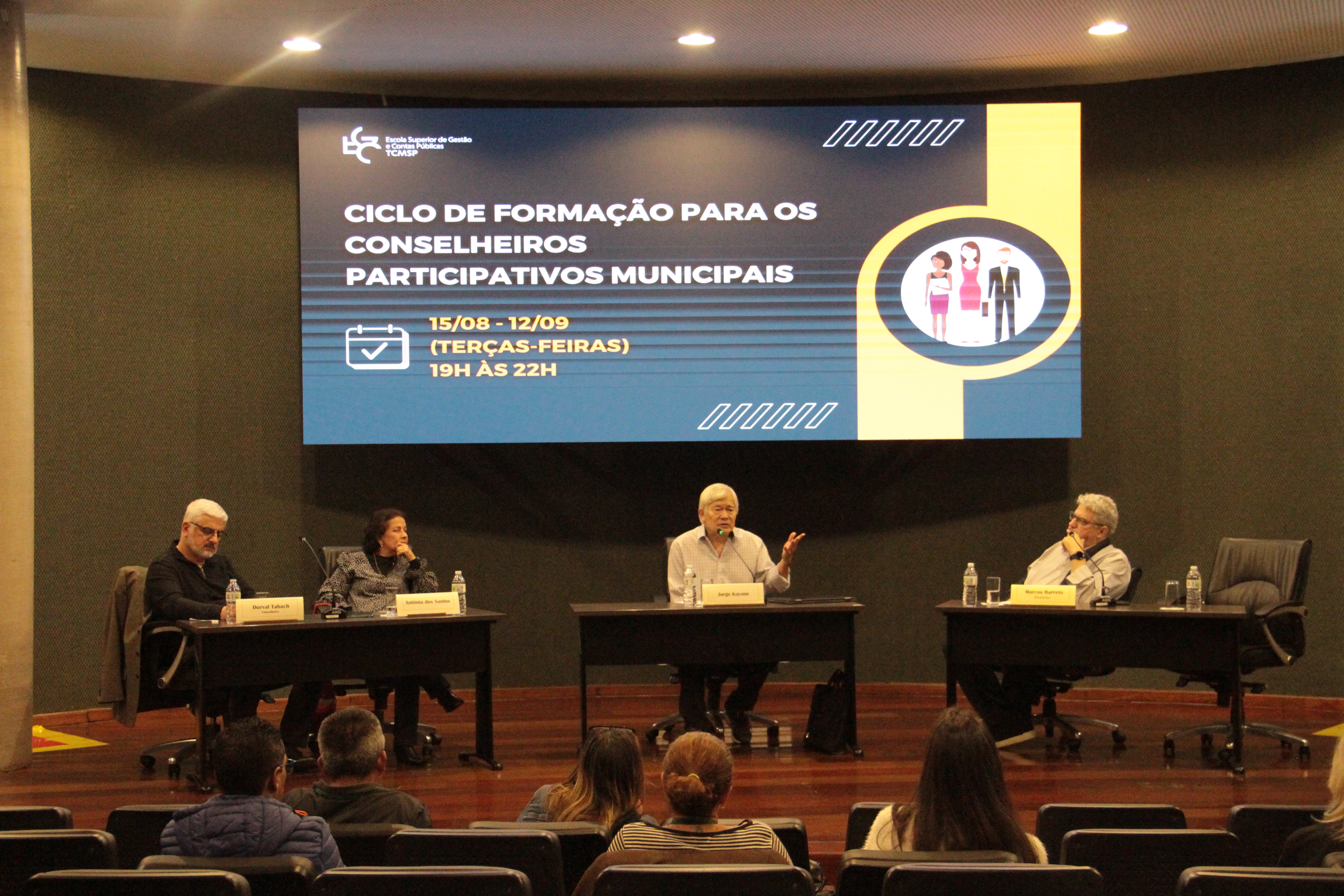 O encontro contou com as presenças do médico e pesquisador do Instituto Pólis, Jorge Kayano, da professora Antonia dos Santos, coordenadora desse curso promovido pela EGC, e do conselheiro participativo junto à Subprefeitura de Vila Mariana, Durval Tabach. O chefe de gabinete da instituição de ensino, Marcos Barreto, foi o responsável pela apresentação e mediação do encontro.