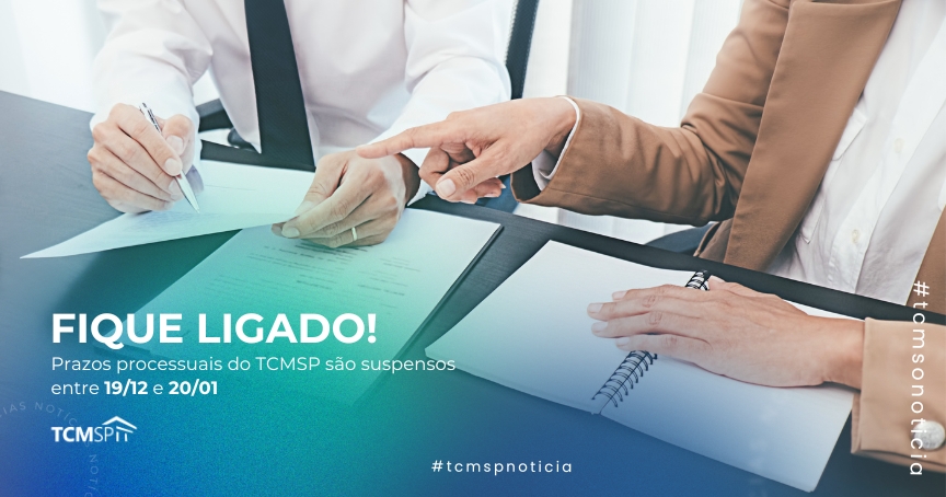 Os prazos processuais no TCMSP ficam suspensos a partir do dia 19 de dezembro de 2024 (quinta) e serão retomados no próximo dia 20 de janeiro (segunda). A decisão foi publicada no Diário Oficial da Cidade nesta terça-feira (10/12) e o conteúdo está disponível na Portaria SG/GAB nº 09/2024, que pode ser vista neste link.